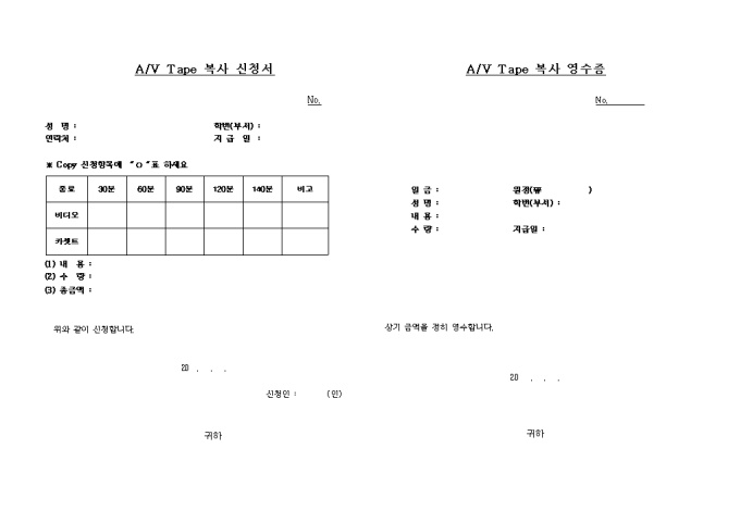 9,000원/월비디오,카셋트의 복사 신청할때 사용하는 양식입니다.복사영수증도 붙어있네요.
