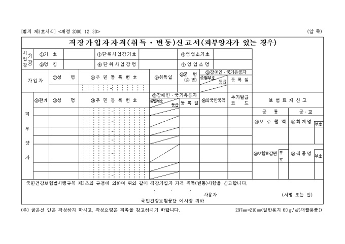 국민건강보험법시행규칙 제3조의 규정에 의하여 위와 같이 직장가입자 자격 취득(변동) 사항을 신고하실때 사용하는 양식입니다.