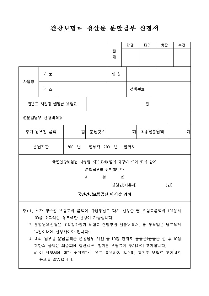 국민건강보험법 시행령 제39조제4항의 규정에 의거 위와 같이 분할납부를 신청하실때 사용하는 양식입니다.