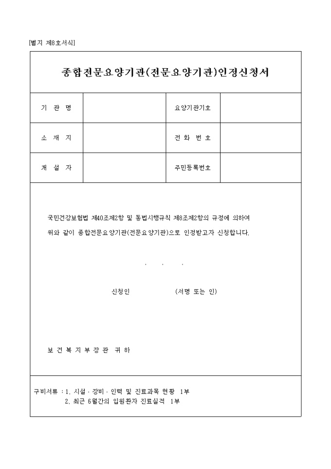 9,000원/월[별지 제8호서식] 종합전문요양기관인정신청서 양식입니다. 국민건강보험법 제40조제2항 및 동법시행규칙 제8조제2항의 규정에 의하여 위와 같이 종합전문요양기관(전문요양기관)으로 인정받고자 신청하실때 사용하는 양식입니다.