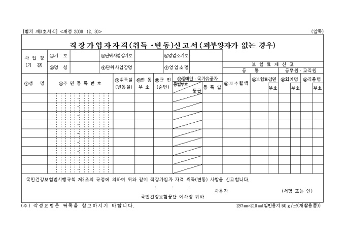 [별지 제3호서식] 직장가입자자격취득변동신고서(피부무) 양식입니다. 국민건강보험법시행규칙 제3조의 규정에 의하여 위와 같이 직장가입자 자격 취득(변동) 사항을 신고하실때 사용하는 양식입니다.