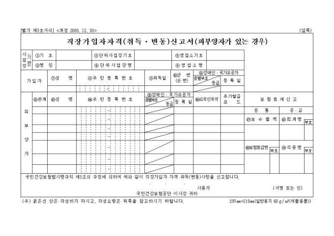 [별지 제3호서식] 직장가입자자격취득변동신고서(피부유) 양식입니다. 국민건강보험법시행규칙 제3조의 규정에 의하여 위와 같이 직장가입자 자격 취득(변동)사항을 신고하실때 사용하는 양식입니다.