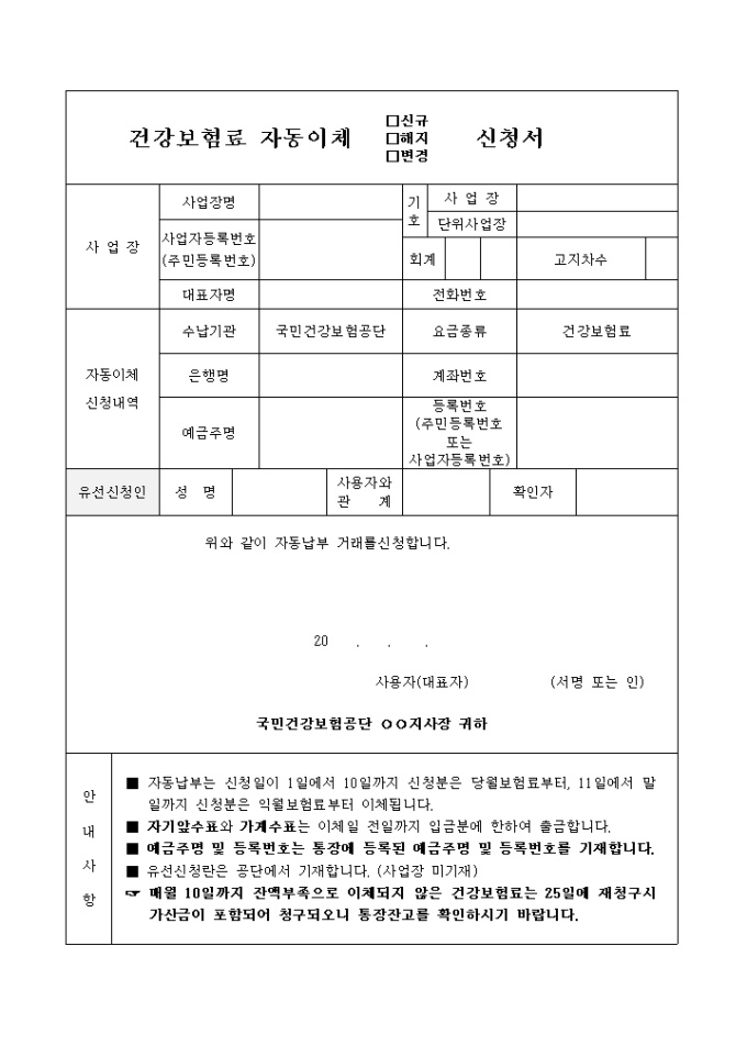 직장자동이체신청서 양식입니다. [안내사항] ■ 자동납부는 신청일이 1일에서 10일까지 신청분은 당월보험료부터, 11일에서 말일까지 신청분은 익월보험료부터 이체됩니다. ■ 자기앞수표와 가계수표는 이체일 전일까지 입금분에 한하여 출금합니다. ■ 예금주명 및 등록번호는 통장에 등록된 예금주명 및 등록번호를 기재합니다. ■ 유선신청란은 공단에서 기재합니다. (사업장 미기재) ☞ 매월 10일까지 잔액부족으로 이체되지 않은 건강보험료는 25일에 재청구