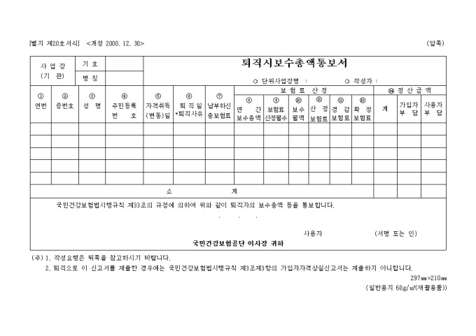 9,000원/월[별지 제20호서식] 퇴직시보수총액통보서 양식입니다. 국민건강보험법시행규칙 제33조의 규정에 의하여 위와 같이 퇴직자의 보수총액 등을 통보하실때 사용하는 양식입니다.
