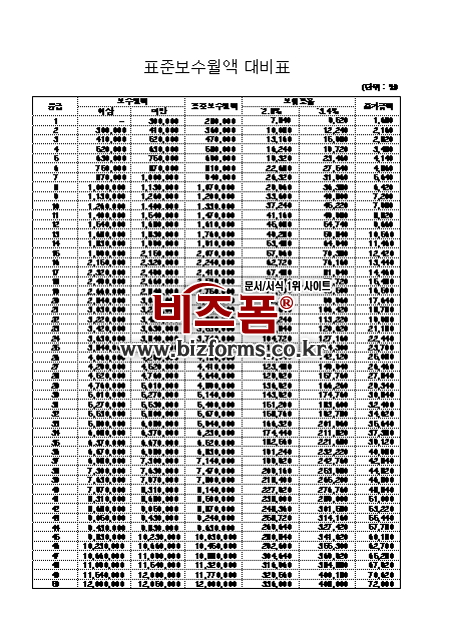 표준보수월액 조건표 예제 양식입니다. 등급별 보수월액,표준보수월액,보험료율,증가금액으로 구성된 예제 양식입니다.