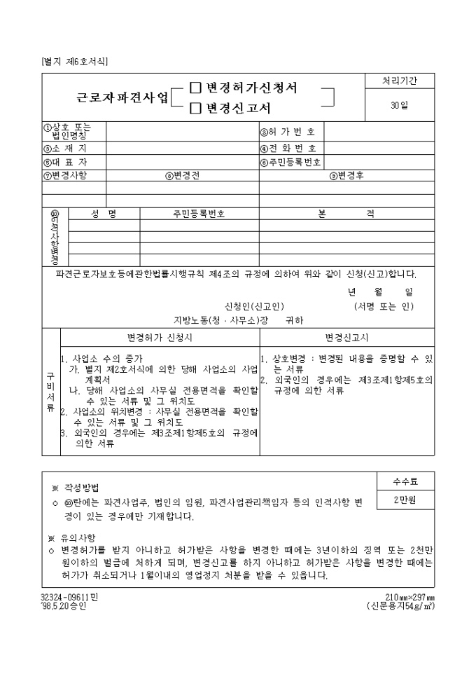 파견근로자보호등에관한법률시행규칙 제4조의 규정에 의하여 위와 같이 신청(신고)할 때 사용하는 "근로자 파견사업의 변경신고" 양식입니다.