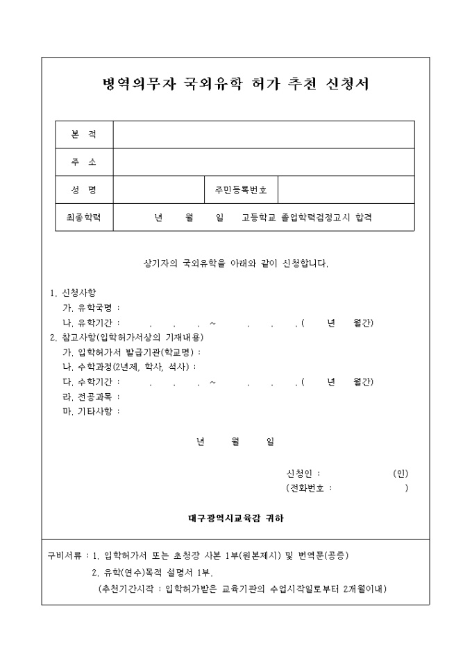 당사자의 인적사항,신청사항,입학허가서상의 기재내용을 기록하는 병역의무자 국외유학 허가 추천 신청서입니다.