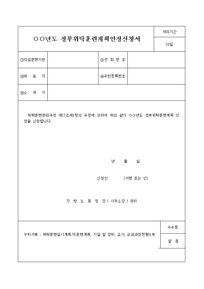 위탁훈련관리규정 제17조제1항의 규정에 의하여 위와 같이 ○○년도 정부위탁훈련계획 인정을 신청할 때 쓰이는 ㅇㅇ년도 정부위탁 훈련계획 인정신청서 양식입니다.