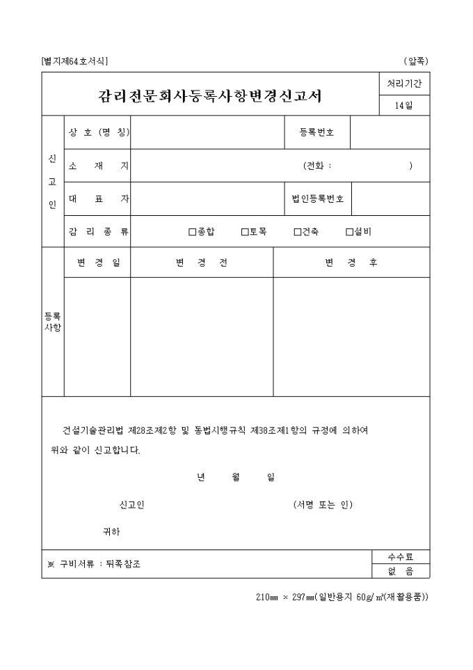 건설기술관리법 제28조제2항 및 동법시행규칙 제38조제1항의 규정에 의하여 감리전문회사 휴폐업 및 등록사항 변경을 신고시에 쓰이는 "감리전문회사 휴폐업(등록사항변경) 신고서" 양식입니다.