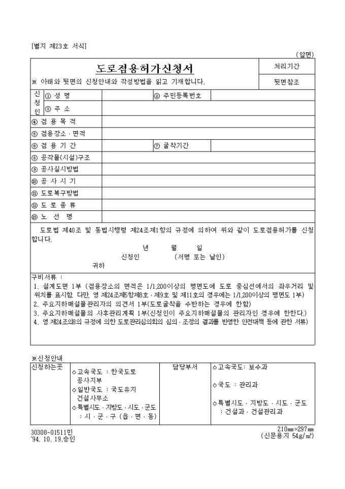 9,000원/월도로법 제40조 및 동법시행령 제24조제1항의 규정에 의하여 도로점용허가(선전탑, 아취설치 및 교육시설 사용)를 신청하고자 할 때 쓰이는 "도로점용 허가(선전탑,아취설치및육교시설사용) 신청서" 양식입니다.