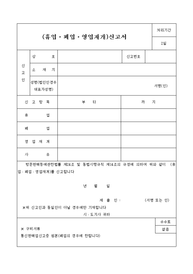 방문판매등에관한법률 제24조 및 동법시행규칙 제14조의 규정에 의하여 위와 같이 (휴업․폐업․영업재개)를 신고합니다