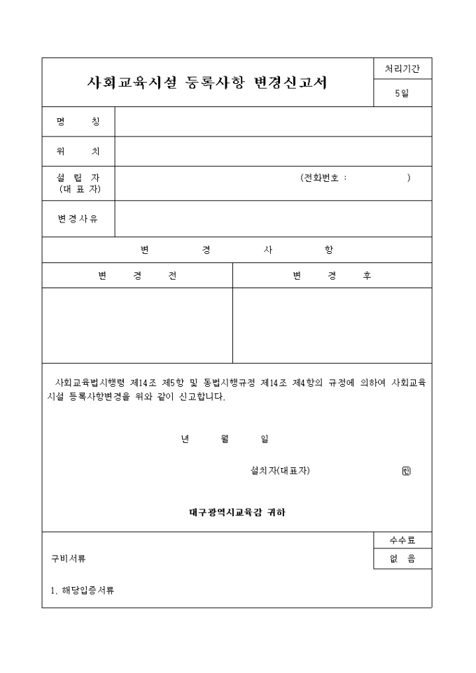 9,000원/월사회교육법시행령 제14조 제5항 및 동법시행규정 제14조 제4항의 규정에 의하여 사회교육시설 등록사항변경을 신고할때 사용하는 양식입니다.