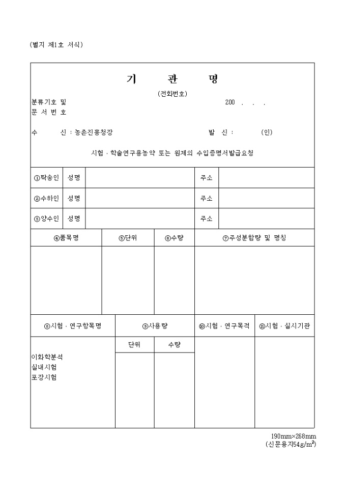 9,000원/월시험 및 학술연구용 농약수입 증명서발급 양식입니다.