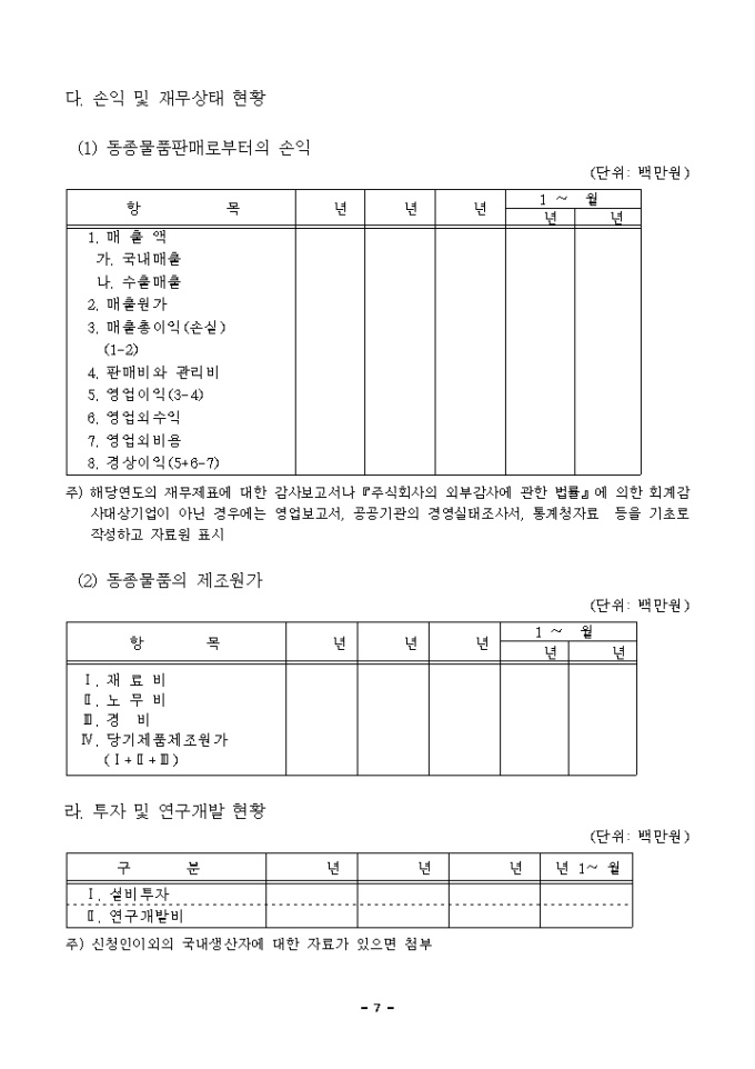 신청서를 제출하실 때에는 신청서와 관련 증빙자료 각 3부씩을 제출하여야 하며, 각종 자료는 과거 3년이상의 수치를 작성하여 주시고, 신청서내용중 항목별 기재내용이 많을 경우에는 별지를 추가하여 작성하여도 무방합니다.
