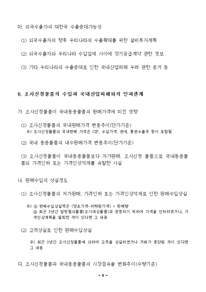 이 신청서는 관세법 제10조 및 동법시행령 제4조의2 내지 제4조의8의 규정에 의한 덤핑방지관세부과를 위한 조사신청서입니다.