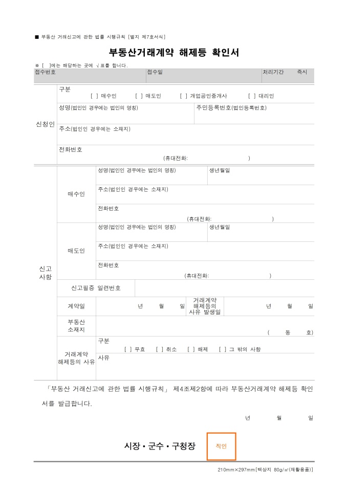 9,000원/월부동산 거래신고에 관한 법률 시행규칙 [시행 2014.7.29.] [국토교통부령 제116호, 2014.7.29., 제정]의 [서식 7] 부동산거래계약 해제등 확인서 별표/서식 및 양식 입니다.