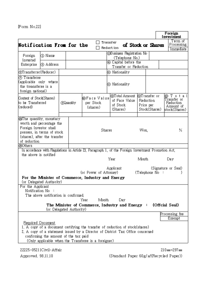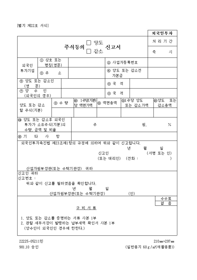 외국인투자촉진법 제23조제1항의 규정에 의하여 위와 같이 신고하고자 할 때 사용하는 "주식등의 양도 또는 감소신고서" 양식입니다.