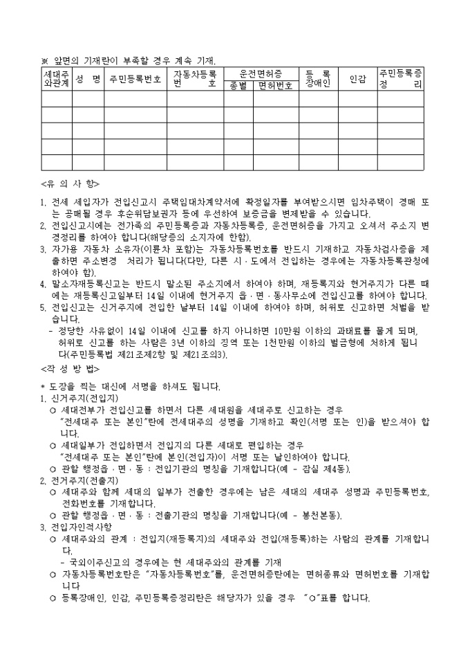“전세대주 또는 본인”란에 본인(전입자)이 서명 또는 날인하여야 합니다.