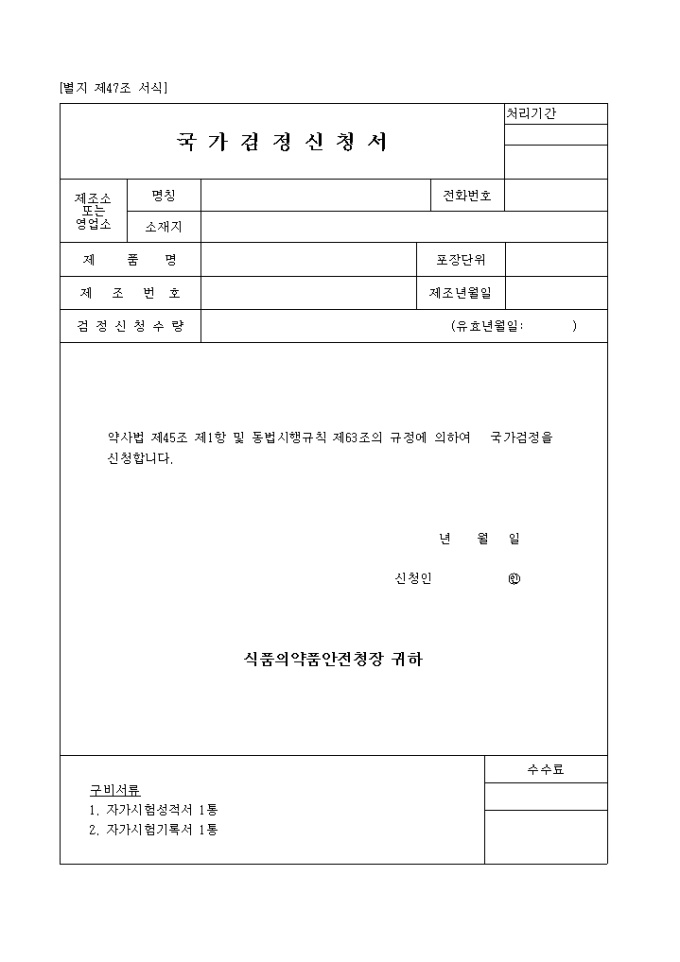 9,000원/월약사법 제45조 제1항 및 동법시행규칙 제63조의 규정에 의하여 국가검정을 신청할 때 사용하는 "디프테리아, 파상풍 톡소이드 및 백일해 백신검정" 양식입니다.