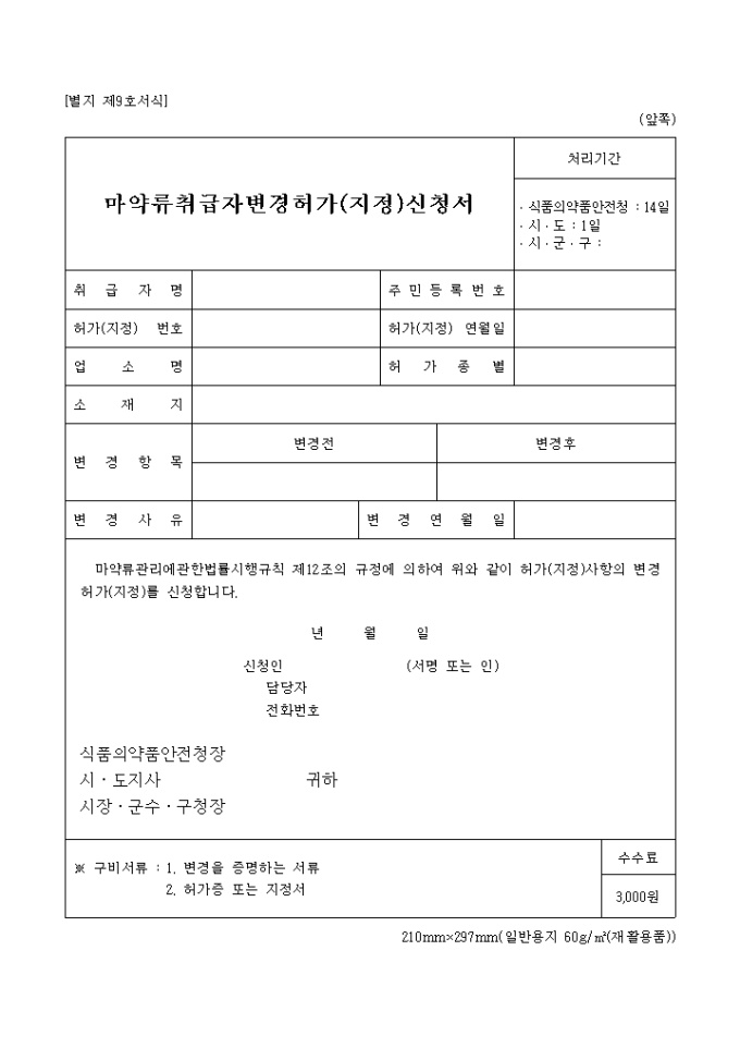 마약류관리에관한법률시행규칙 제12조의 규정에 의하여 위와 같이 허가(지정)사항의 변경허가(지정)를 신청할 때 사용하는 "마약류 취급자 변경(수출입업자,제조업자,원료사용자)" 양식입니다.