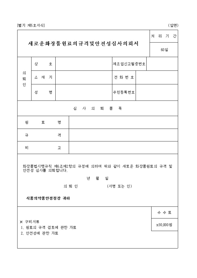 화장품법시행규칙 제6조제2항의 규정에 의하여 위와 같이 새로운 화장품원료의 규격 및 안전성 심사를 의뢰할 때 사용하는 "새로운 화장품 원료의 규격 및 안전성심사" 양식입니다.