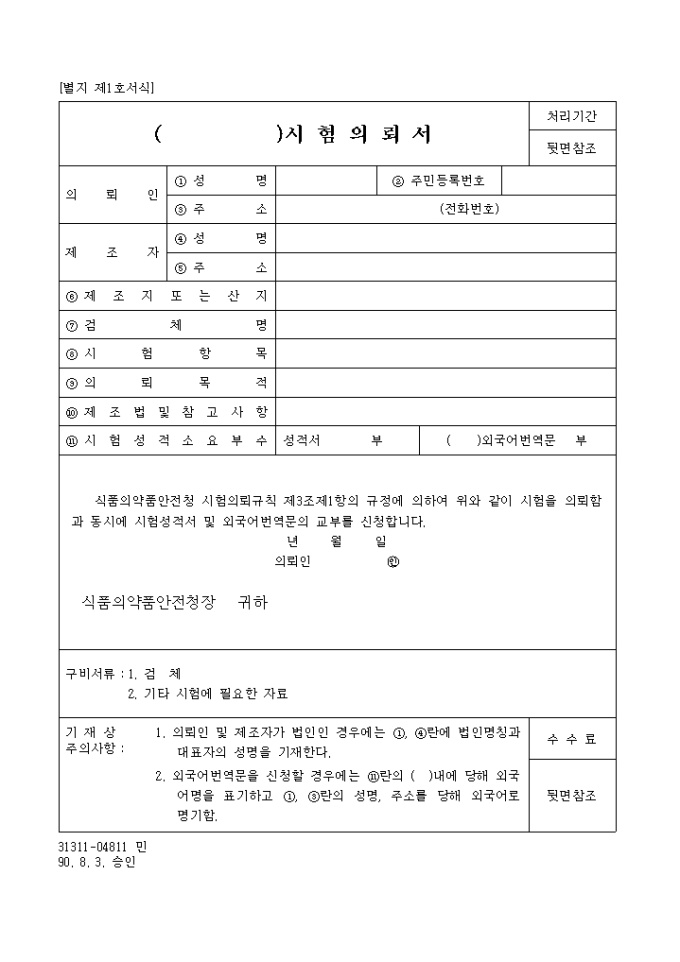 9,000원/월식품의약품안전청 시험의뢰규칙 제3조제1항의 규정에 의하여 위와 같이 시험을 의뢰함과 동시에 시험성적서 및 외국어번역문의 교부를 신청할 때 사용하는 "수입생약 및 생약 제제(단일제제)검정" 양식입니다.