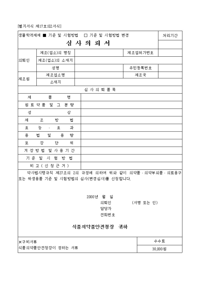 약사법시행규칙 제27조의 2의 규정에 의하여 위와 같이 의약품․의약부외품․의료용구 또는 위생용품 기준 및 시험방법의 심사(변경심사)를 신청할 때 사용하는 "의료용구 기준 및 시험방법 변경심사" 양식입니다.