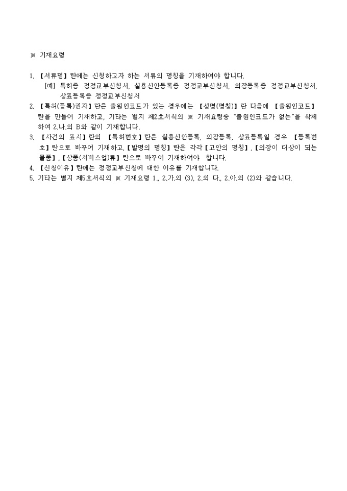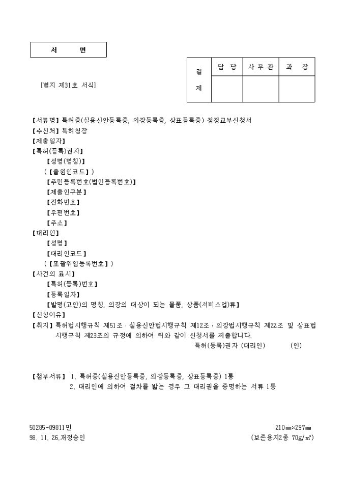 【취지】특허법시행규칙 제51조․실용신안법시행규칙 제12조․의장법시행규칙 제22조 및 상표법시행규칙 제23조의 규정에 의하여 위와 같이 신청서를 제출합니다.
