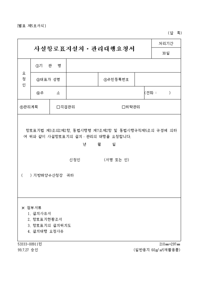 사설항로표지설치, 관리대행 요청서(별지 제5호)