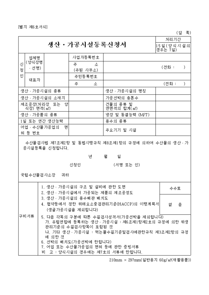 생산, 가공시설등록신청서