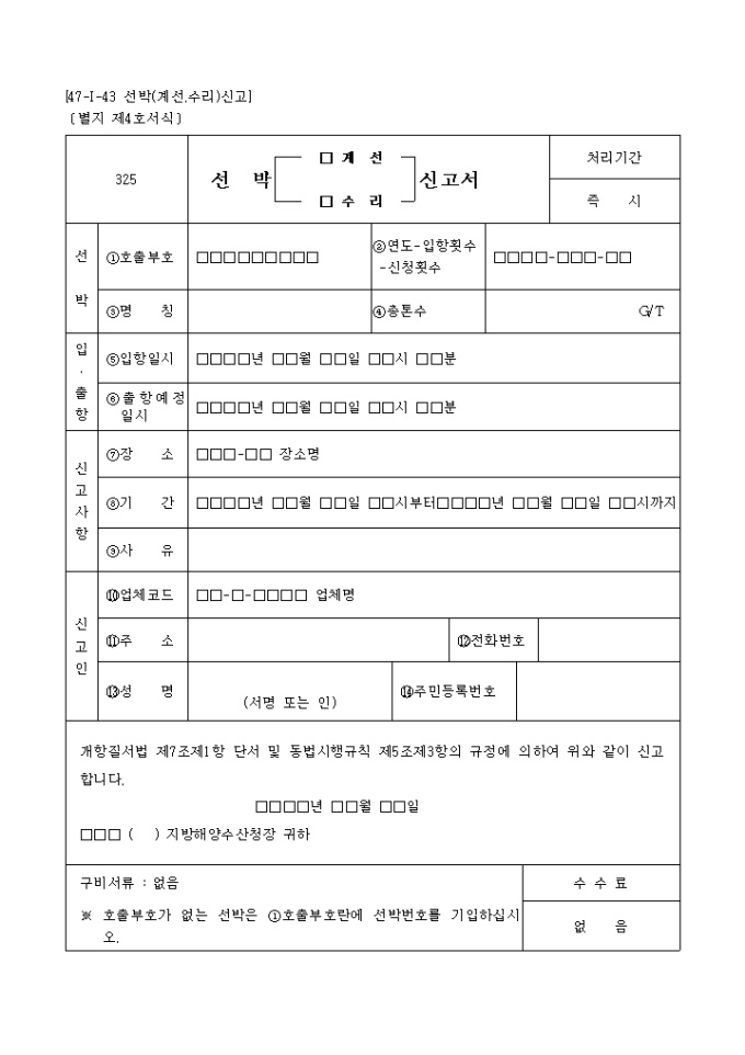 9,000원/월개항질서법 제7조제1항 단서 및 동법시행규칙 제5조제3항의 규정에 의하여 위와 같이 신고하고자 할 때 사용하는 "선박 (계선,수리)신고서" 양식입니다.