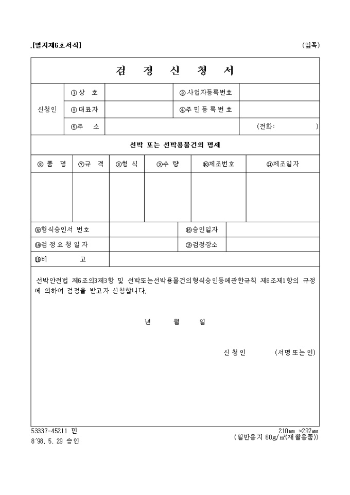 선박 및 선박용물건의검정신청서