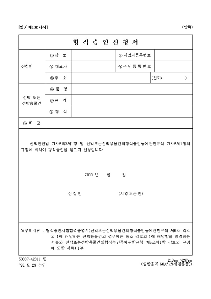 9,000원/월선박안전법 제6조의3제1항 및 선박또는선박용물건의형식승인등에관한규칙 제3조제1항의 규정에 의하여 형식승인을 얻고자 신청하고자 할 때 사용하는 "선박 및 선박용 물건의 형식 승인신청서" 양식입니다.