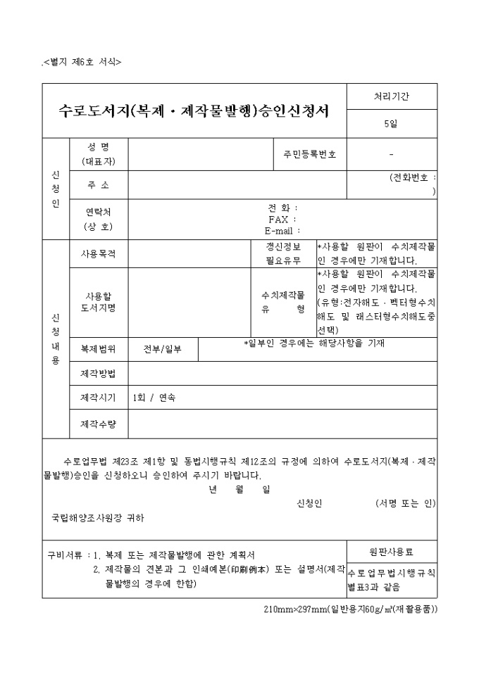 수로업무법 제23조 제1항 및 동법시행규칙 제12조의 규정에 의하여 수로도서지(복제․제작물발행)승인을 신청하오니 승인을 득하고자 할 때 사용하는 "수로도서지(복제,제작물발행) 승인신청서" 양식입니다.