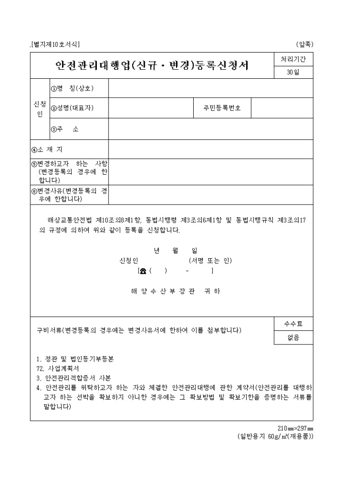 해상교통안전법 제10조의8제1항, 동법시행령 제3조의6제1항 및 동법시행규칙 제3조의17의 규정에 의하여 위와 같이 등록을 신청할 때 사용하는 "안전 관리 대행업(신규, 변경) 등록신청서" 양식입니다.