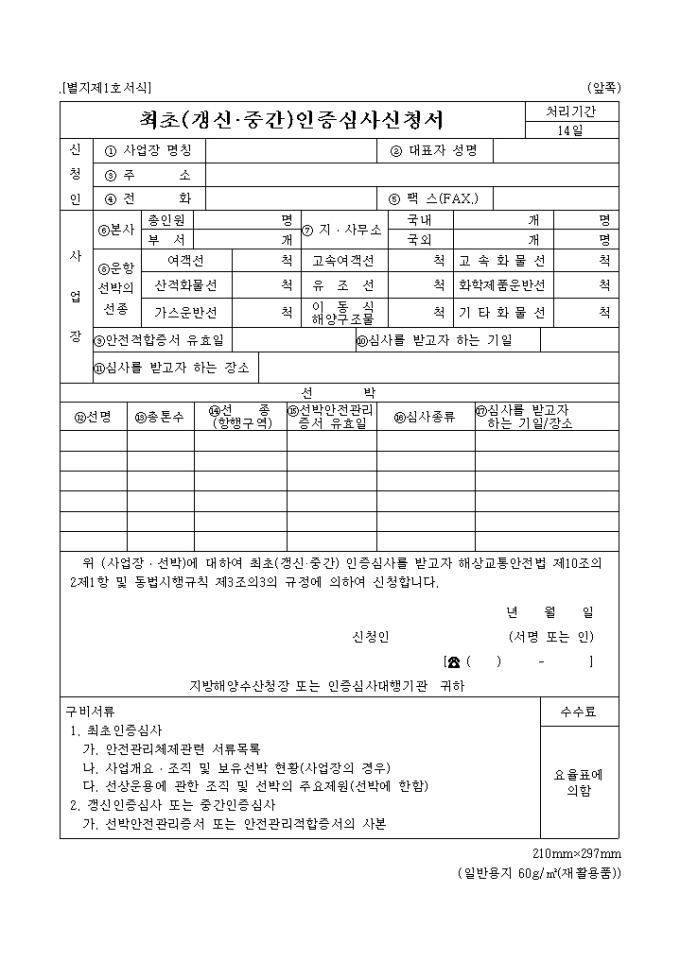 위 (사업장․선박)에 대하여 최초(갱신·중간) 인증심사를 받고자 해상교통안전법 제10조의2제1항 및 동법시행규칙 제3조의3의 규정에 의하여 신청할 때 사용하는 "최초(갱신,중간) 인증 심사신청서" 양식입니다.