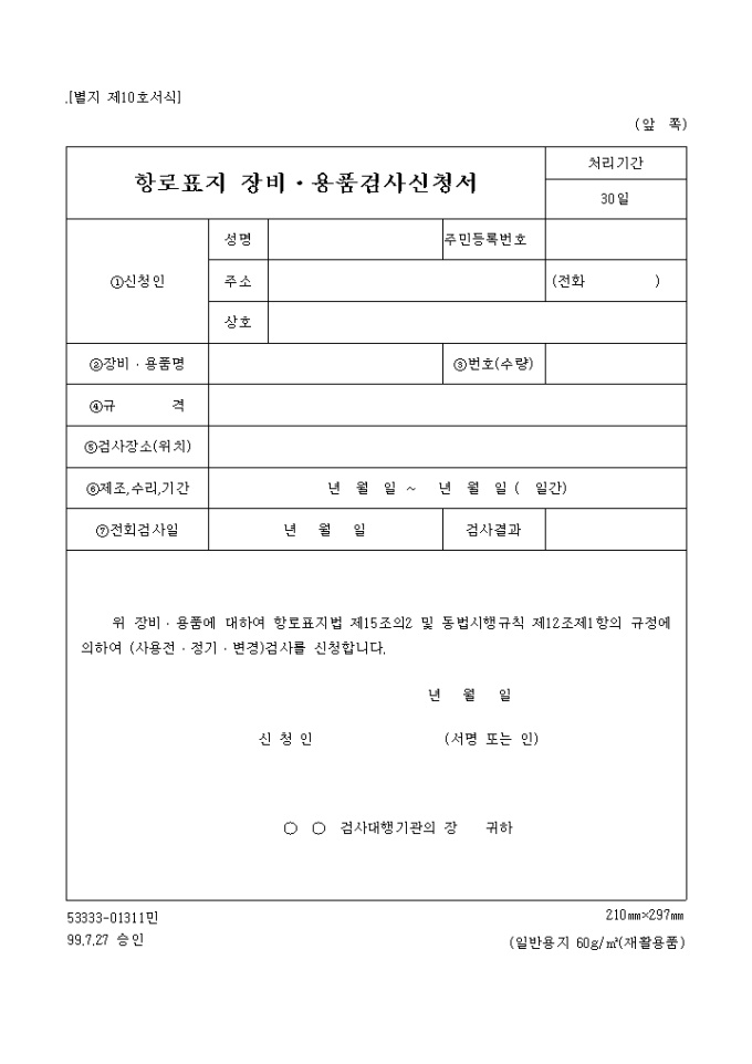 9,000원/월위 장비․용품에 대하여 항로표지법 제15조의2 및 동법시행규칙 제12조제1항의 규정에 의하여 (사용전․정기․변경)검사를 신청할 때 사용하는 "항로표지 장비, 용품 검사신청서" 양식입니다.