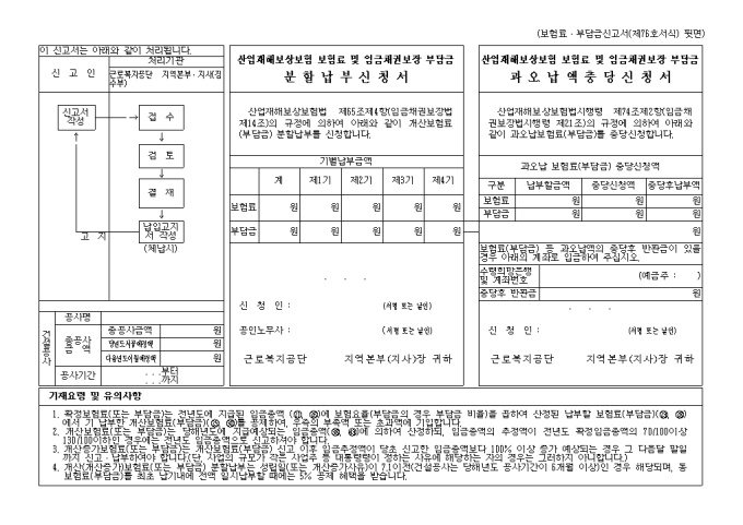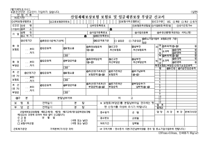 9,000원/월산업재해보상보험법 제65조제1항, 제2항, 제67조제1항(임금채권보장법 제14조)의 규정에 의하여 위와 같이 신고할 때 사용하는 "산업재해 보상보험 보험료 및 임금채권 보장 부담금신고서" 양식입니다.