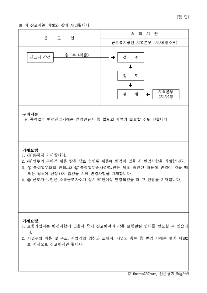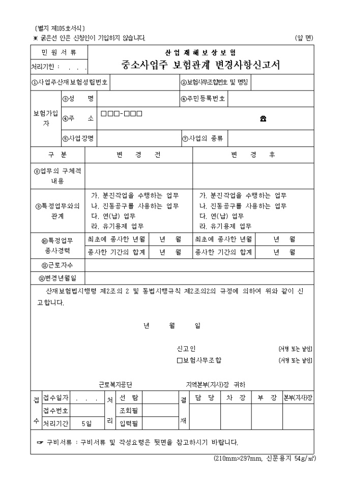 9,000원/월산재보험법시행령 제2조의 2 및 동법시행규칙 제2조의2의 규정에 의하여 위와 같이 신고할 때 사용하는 "산업재해 보상보험 중소사업주 보험관계 변경사항 신고서" 양식입니다.