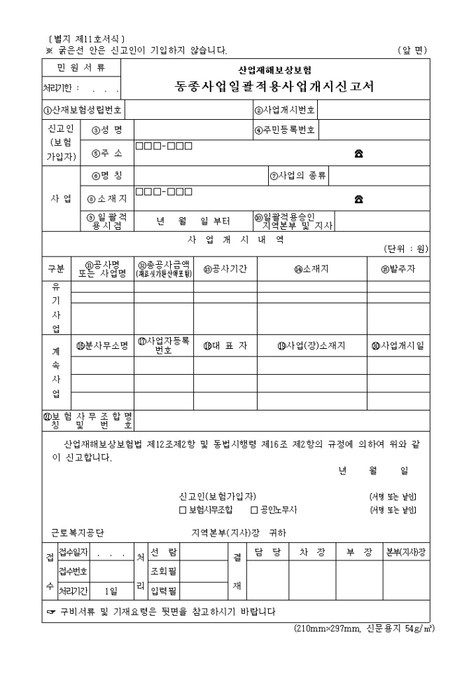 9,000원/월산업재해보상보험법 제12조제2항 및 동법시행령 제16조 제2항의 규정에 의하여 위와 같이 신고할 때 쓰이는 "산업 재해 보상보험 동종사업 일괄적용 사업개시신고" 양식입니다.