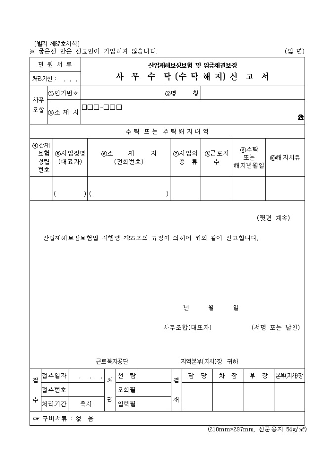 산업재해보상보험법 시행령 제55조의 규정에 의하여 위와 같이 신고할 때 쓰는 "산업재해 보상보험 및 임금채권 보장사무 수탁(수탁해지)신고서" 양식입니다.