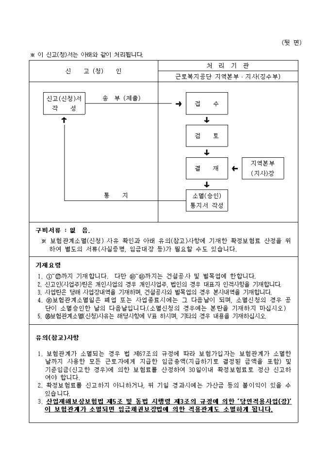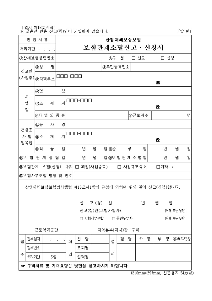 9,000원/월산업재해 보상보험법 시행령 제16조제1항의 규정에 의하여 위와 같이 신고(신청)할 때 사용하는 "산업재해 보상보험 보험관계 소멸신고·신청서" 양식입니다.
