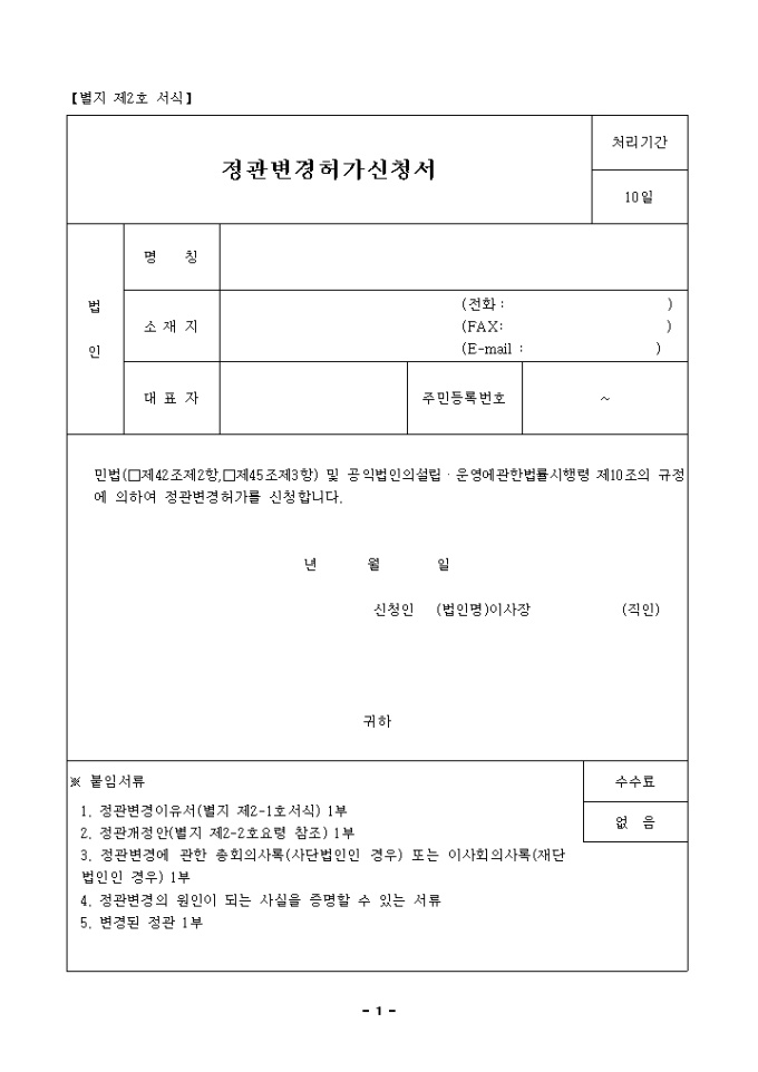 9,000원/월정관 변경 허가신청서 양식입니다.