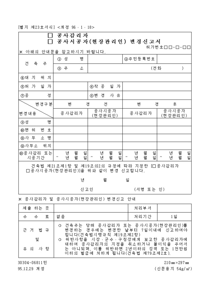 9,000원/월(공사감리자,공사시공자(현장관리인)) 변경신고서 양식입니다.