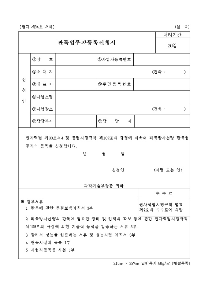 원자력법 제90조의4 및 동법시행규칙 제107조의 규정에 의하여 피폭방사선량 판독업무자의 등록을 신청합니다.
