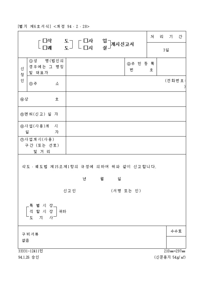 (삭도,궤도)(사업,시설)개시 신고서 양식입니다.