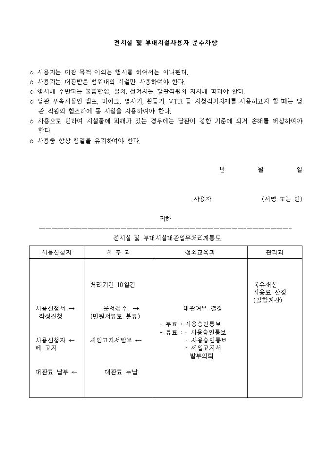 9,000원/월위와 같이 국립중앙박물관 대관규정 제4조 규정에 의거 사용자 준수사항을 성실히 이행할 것을 조건으로 시설사용을 신청하고자 할 때 사용하는 "국립 중앙 박물관 전시실 및 부대시설 사용신청서" 양식입니다.