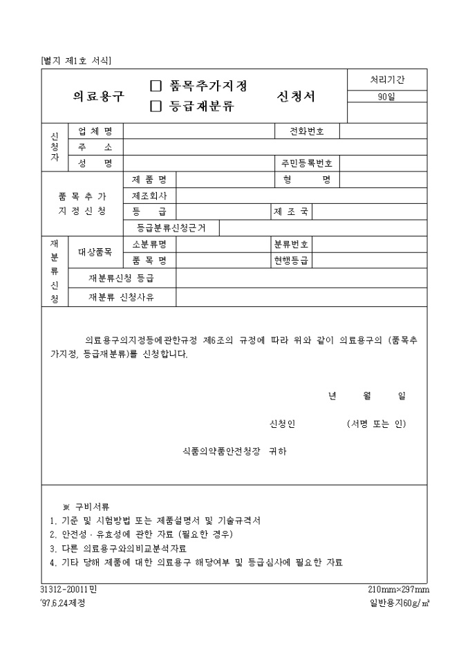 9,000원/월의료용구의지정등에관한규정 제6조의 규정에 따라 위와 같이 의료용구의 (품목추가지정, 등급재분류)를 신청할 때 사용하는 "의료용구 품목추가 지정, 등급 재분류신청서" 양식입니다.