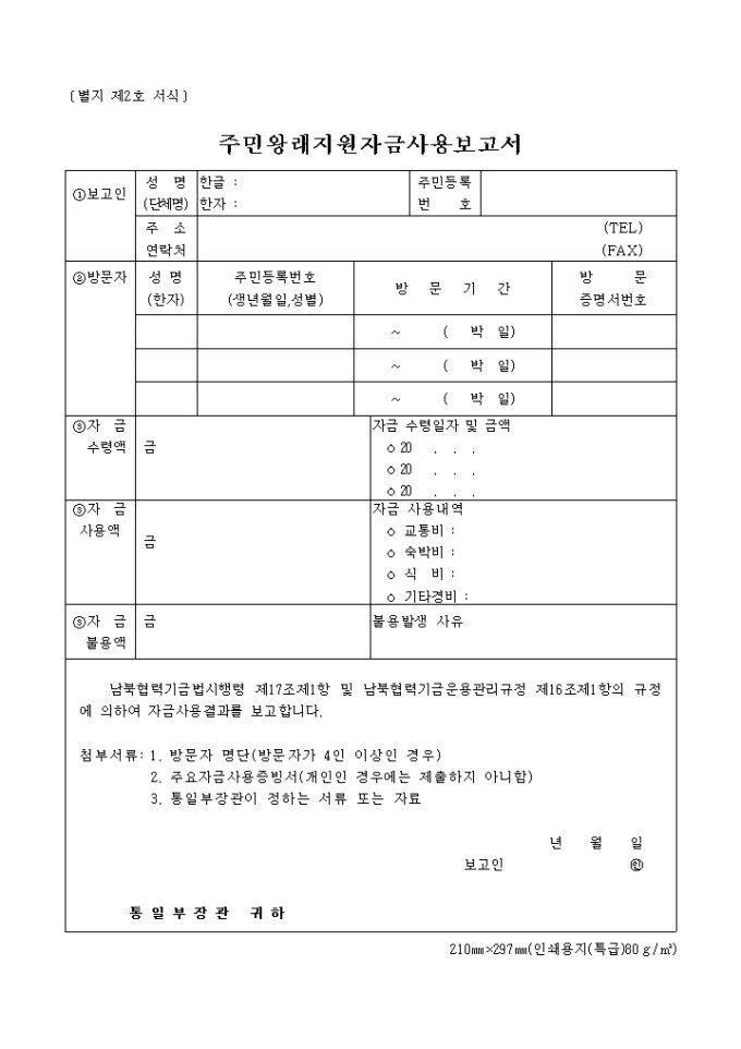 9,000원/월남북협력기금법시행령 제17조제1항 및 남북협력기금운용관리규정 제16조제1항의 규정에 의하여 자금사용결과를 보고할 때 사용하는 "주민왕래 지원자금 사용보고서" 양식입니다.