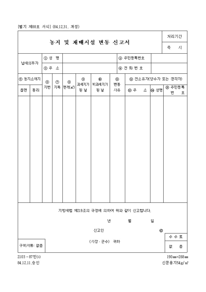 9,000원/월지방세법 제219조의 규정에 의하여 위와 같이 신고할 때 사용하는 "농지 및 재배시설 변동신고서" 양식입니다.